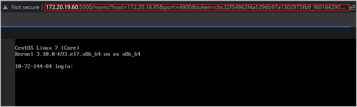 curl -H "Content-Type: application/json;charset=UTF-8" \ -X PUT -d '{"logInByAccount":{"accountName":"admin","password":"b109f3bbbc244eb82441917ed06d618b9008dd09b3befd1b5e07394c706a8bb980b1d7785e5976ec049b46df5f1326af5a2ea6d103fd07c95385ffab0cacbc86" }}' \ http://localhost:8080/zstack/v1/accounts/login其中:{"inventory":{"uuid":"cbc32f54862f4a5296b97a1302975fb9","accountUuid":"a07965e9d6f34924824fc5e9a6518fc3","userUuid":"a07965e9d6f34924824fc5e9a6518fc3","expiredDate":"Oct 17, 2022 10:43:53 PM","createDate":"Oct 17, 2022 8:43:53 PM","noSessionEvaluation":false}}其中:curl -H "Content-Type: application/json;charset=UTF-8" -H "Authorization: OAuth cbc32f54862f4a5296b97a1302975fb9" \ -X PUT -d '{"params":{"vmInstanceUuid":"f601842905994688a3cf7100e8d54b23"}}' \ http://localhost:8080/zstack/v1/consoles其中:{"apiTimeout":1800000,"location":"http://172.20.14.227:8080/zstack/v1/api-jobs/c41ec46dd7f546a48c31d9d0ca2c89d8"}其中:curl -H "Content-Type: application/json;charset=UTF-8" \ -X GET http://172.20.14.227:8080/zstack/v1/api-jobs/c41ec46dd7f546a48c31d9d0ca2c89d8 {"inventory":{"scheme":"http","targetScheme":"vnc","hostname":"172.20.16.95","port":4900,"token":"cbc32f54862f4a5296b97a1302975fb9_f601842905994688a3cf7100e8d54b23_1666013527.59","version":"4.5.0"}}其中:将以上字段拼接,即可获取云主机控制台地址为:http://172.20.19.60:5000/novnc?host=172.20.16.95&port=4900&token=cbc32f54862f4a5296b97a1302975fb9_f601842905994688a3cf7100e8d54b23_1666013527.59。用户可将该地址输入至Chrome或Firefox浏览器,即可打开云主机控制台。