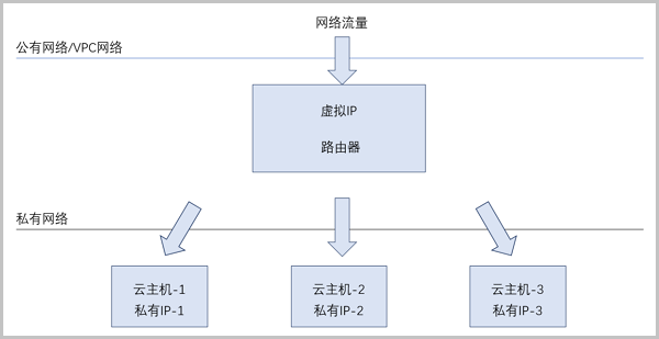 • 负载均衡:将虚拟IP地址的访问流量分发到一组后端的云主机上,并自动检测并隔离不可用的云主机。