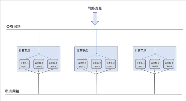 • 每个计算节点分别部署分布式EIP,可分别独立实现公有网络与扁平网络的绑定。