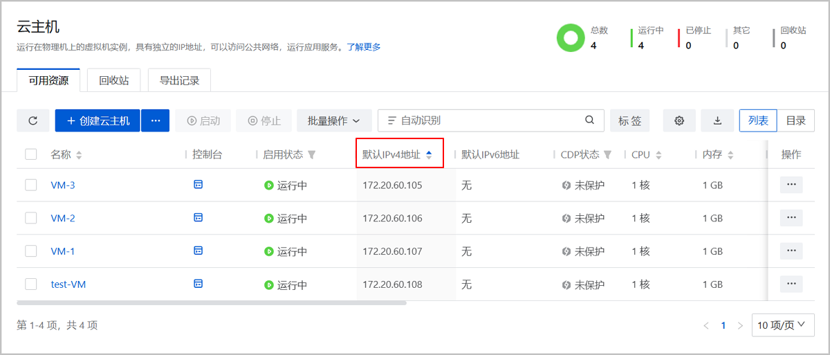 • 多网卡云主机以默认网卡为排序依据。