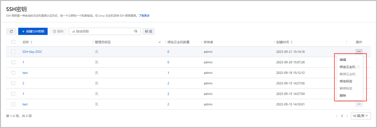 云平台支持SSH密钥的生命周期管理和基本运维操作,包括:创建、删除、编辑、绑定/解绑云主机、绑定/解绑标签。