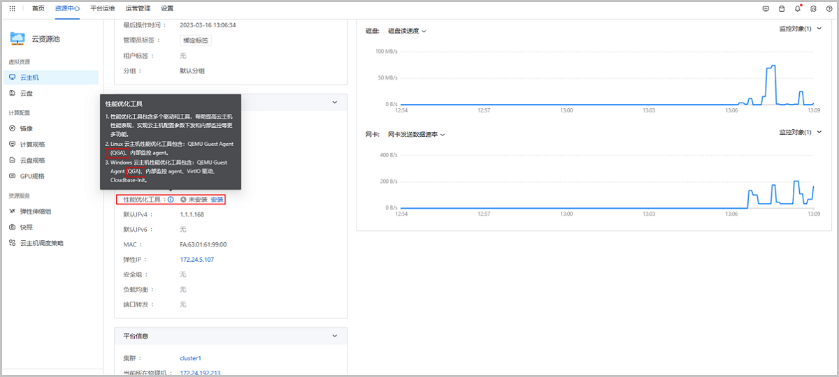 ZStack Cloud 4.6.11开始,性能优化工具进一步集成Qemu Guest Agent (QGA),用于下发云主机配置参数。用户安装性能优化工具后,就能基于其中的QGA实现修改云主机密码、设置时间同步、同步网卡配置等运维操作。