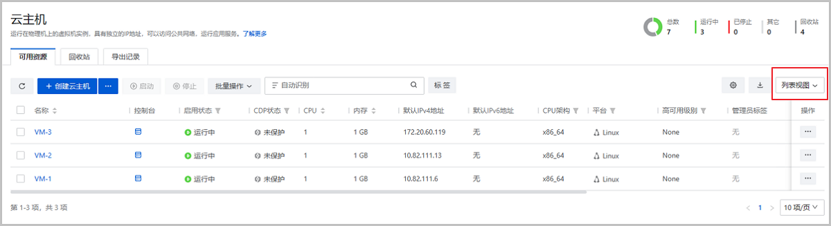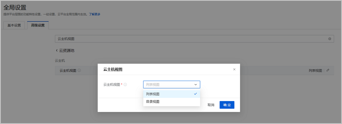 云主机目录视图和列表视图支持灵活切换。若需对当前界面切换云主机视图,直接点击界面右上角视图切换按钮即可。需注意:当前界面刷新后,将恢复默认视图展示,默认视图与全局设置云主机视图所选值保持一致。全局设置云主机视图用于设置云平台全局范围内云主机视图展示方式,默认为列表视图。