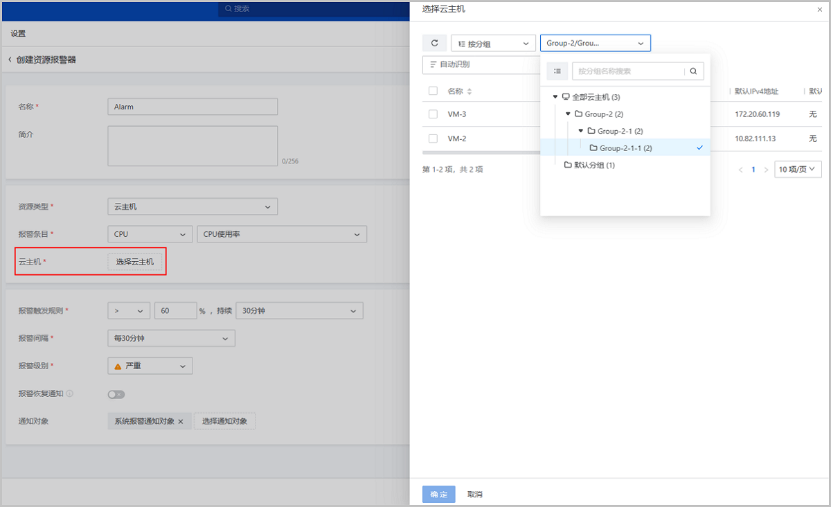 由于云主机支持目录视图,基于云主机创建关联资源时,云主机选择列表支持按目录筛选 (按集群按分组),用户可快速定位目标资源,提高操作效率。