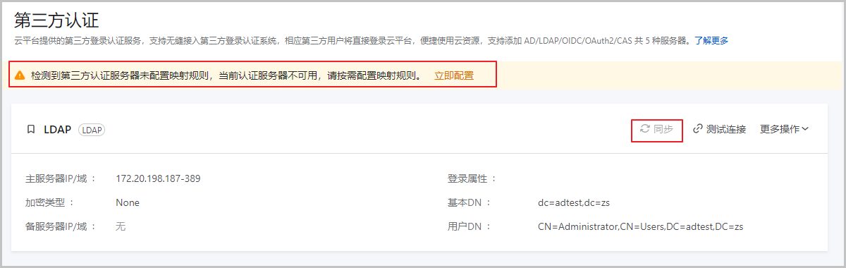 • 服务器配置完成且测试成功后,服务器会提前添加至云平台。此时若未配置映射规则,将不允许进行规则同步,且给出提示,告知待完成映射规则配置和同步后,才可正常使用认证服务器。