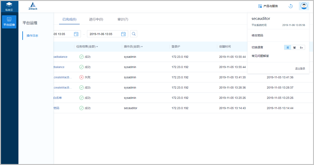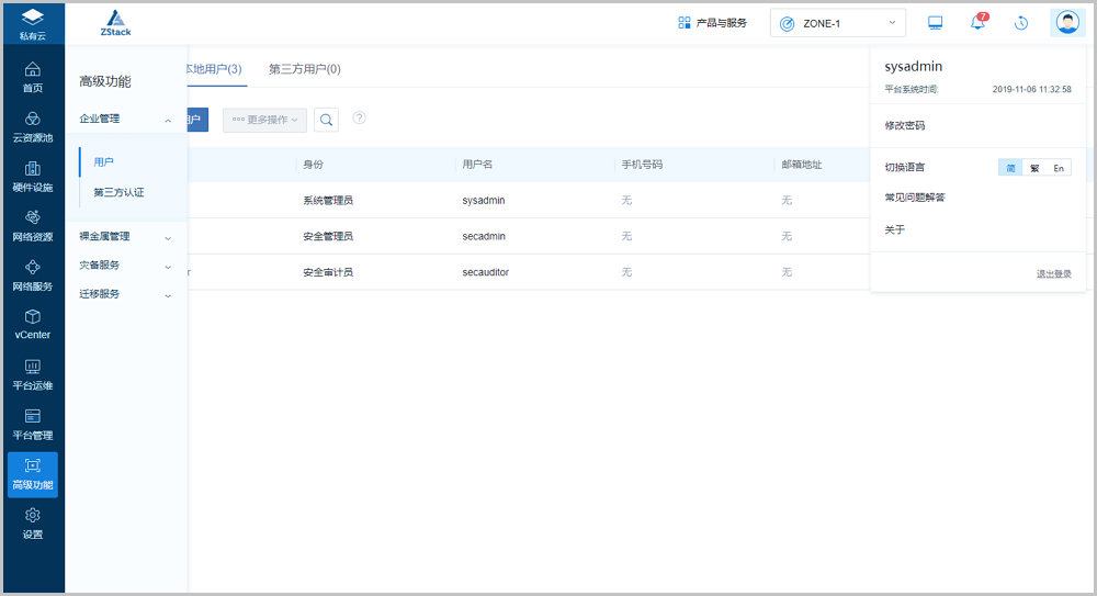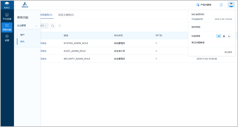 ZStack 3.7.1新增三员分立权限管理,将超级管理员(admin)权限分解并赋予系统管理员、安全管理员和安全审计员。其中,系统管理员负责云平台资源管理、安全管理员负责云平台权限管理、安全审计员负责云平台审计管理,三者之间相互独立,相互制约。