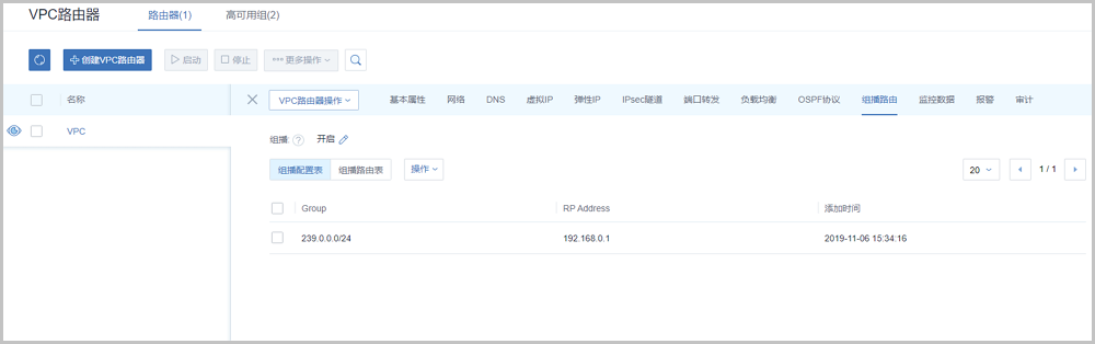 在ZStack 3.7.1中,VPC路由器支持将组播源发送的组播消息转发给云主机。在发送端和接收端实现点对多点连接,可有效降低带宽和CPU负担,提高数据传送效率。在VPC路由器高可用场景下,当VPC路由器状态异常可实现秒级切换,快速恢复组播消息接收,最大限度降低业务影响,如图 1所示: