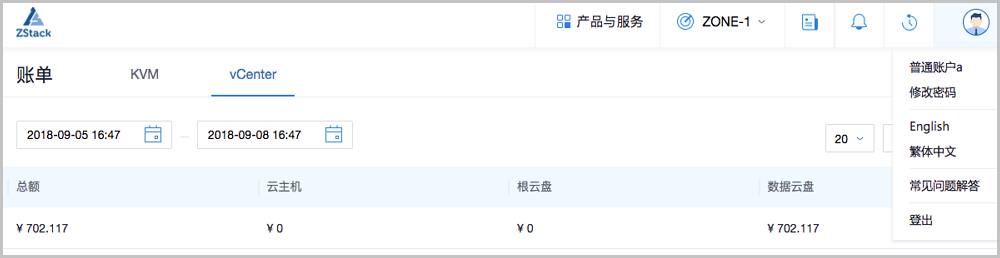 普通账户可查看本账户下的vCenter资源费用信息。如图 2所示:
