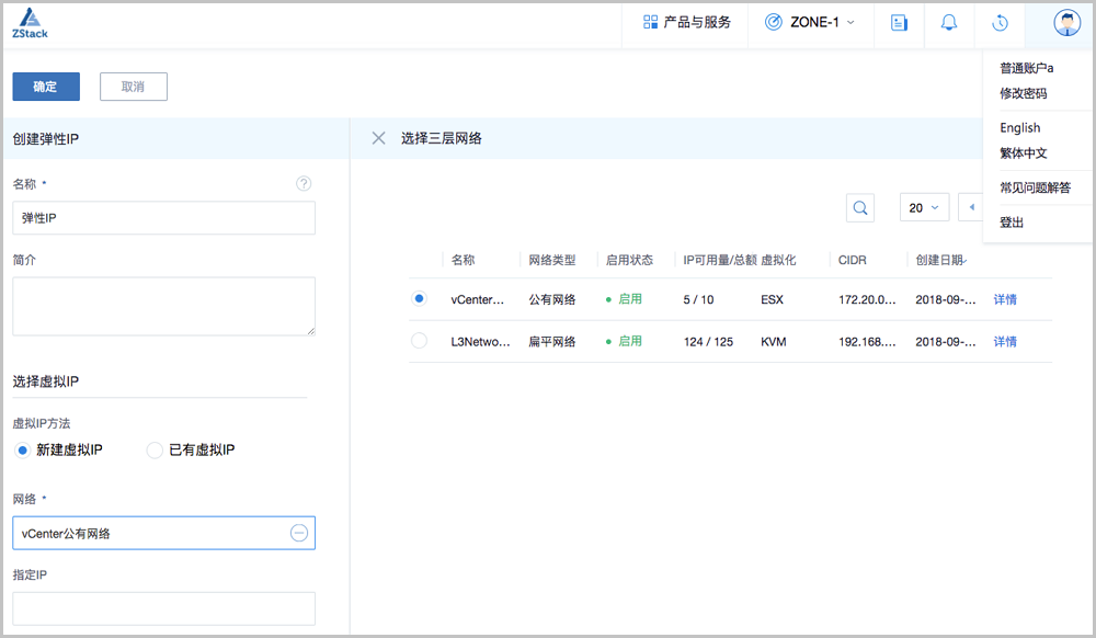 普通账户支持使用vCenter网络服务,包括:虚拟IP、弹性IP、端口转发、负载均衡。如图 4所示: