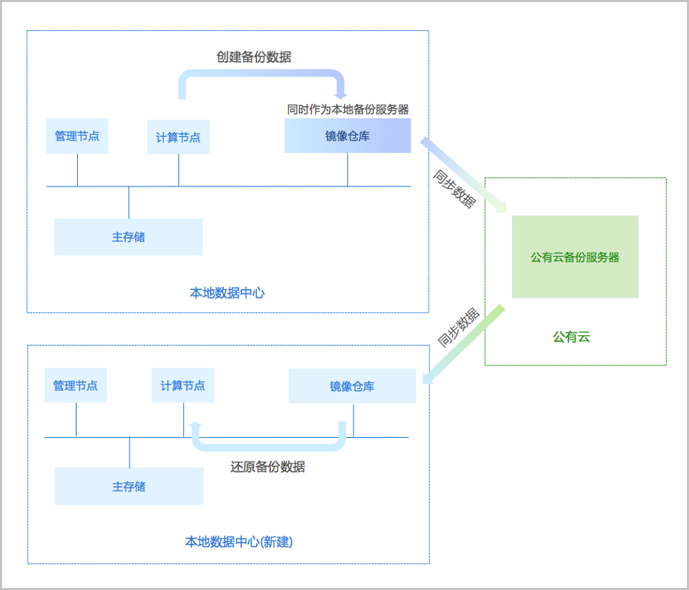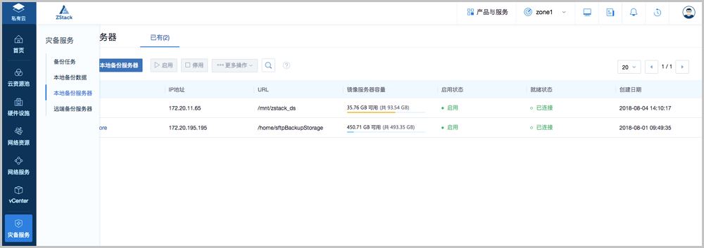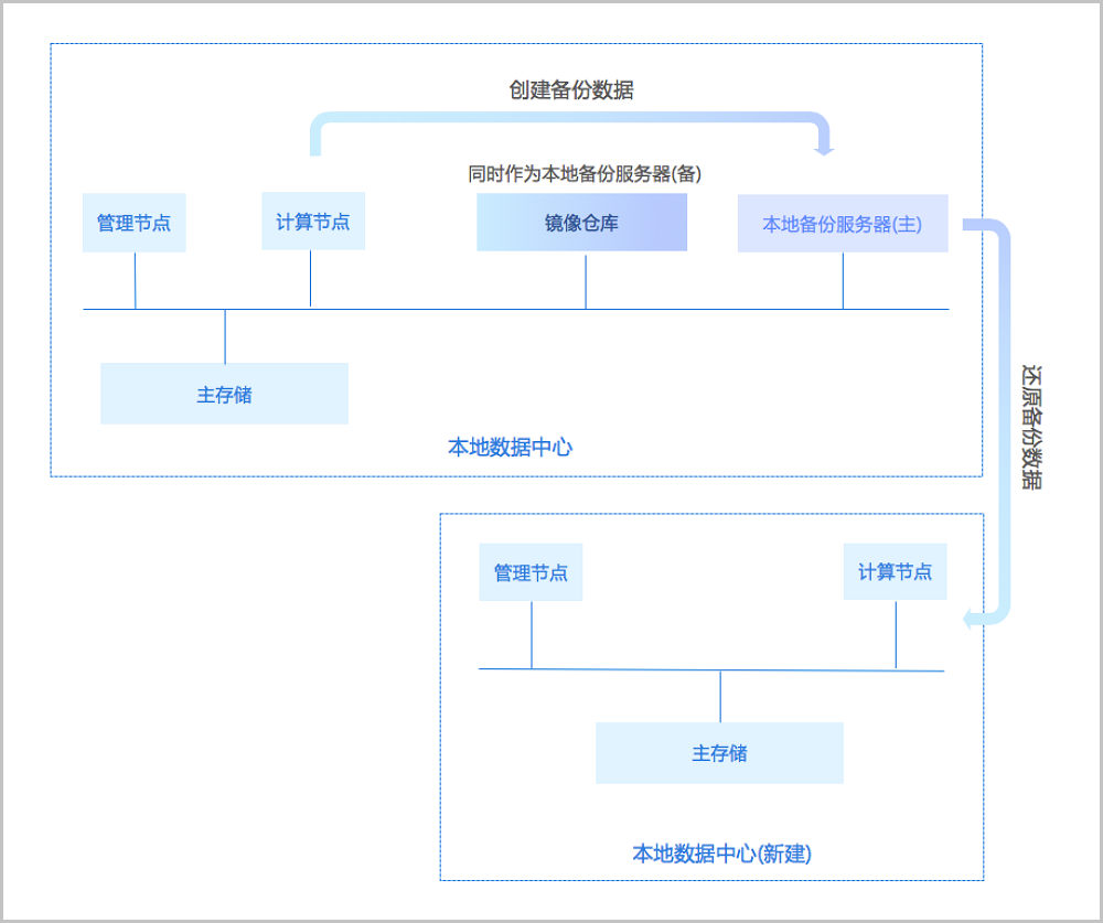 支持将本地部署的镜像仓库作为本地备份服务器,用于存放本地云主机、云盘的定时备份数据。同时本地备份服务器支持主备无缝切换,有效保障业务连续性。如图 1图 2所示: