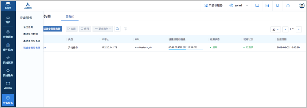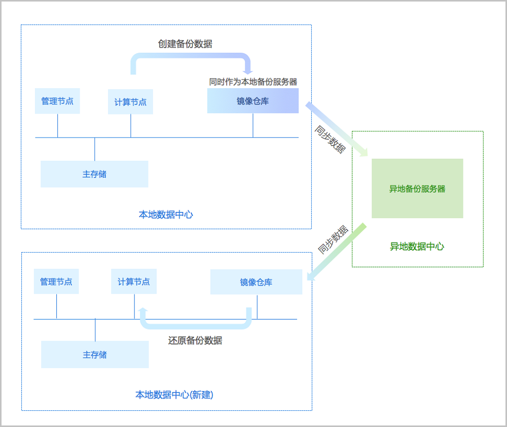 支持将异地机房的存储服务器作为异地备份服务器,用于存放本地云主机、云盘的定时备份数据。备份数据需通过本地备份服务器同步至异地备份服务器。当本地数据中心发生灾难时,完全可依赖异地备份服务器重建数据中心并恢复业务。如图 3图 4所示: