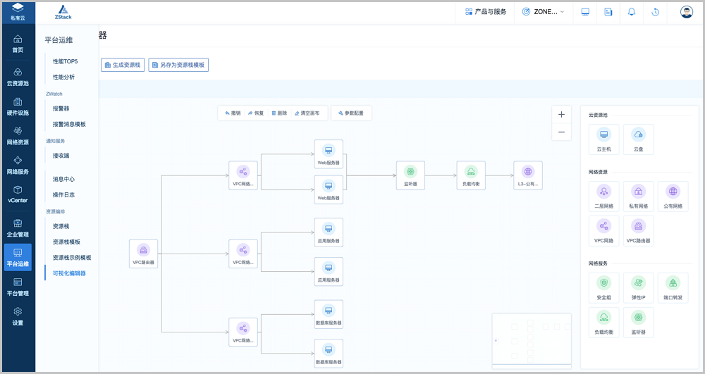ZStack 2.6.0支持可视化资源编排,打开可视化编辑器,通过简单拖曳图标到画布中适当位置,连线创建资源间的依赖关系,并输入需要的参数,即可快速创建资源栈模板,高效编排云资源。如图 1所示: