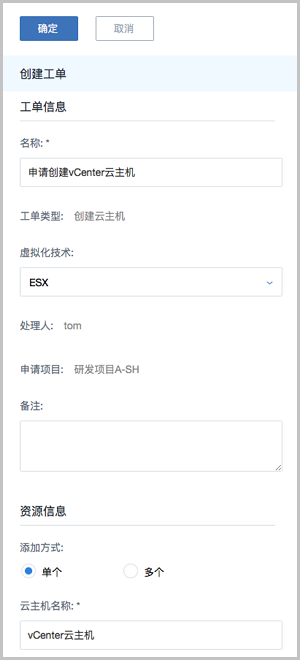 项目成员可提交工单,申请创建vCenter云主机,管理员可进行一键审批,资源将自动部署成功并分发到项目中。如图 2所示: