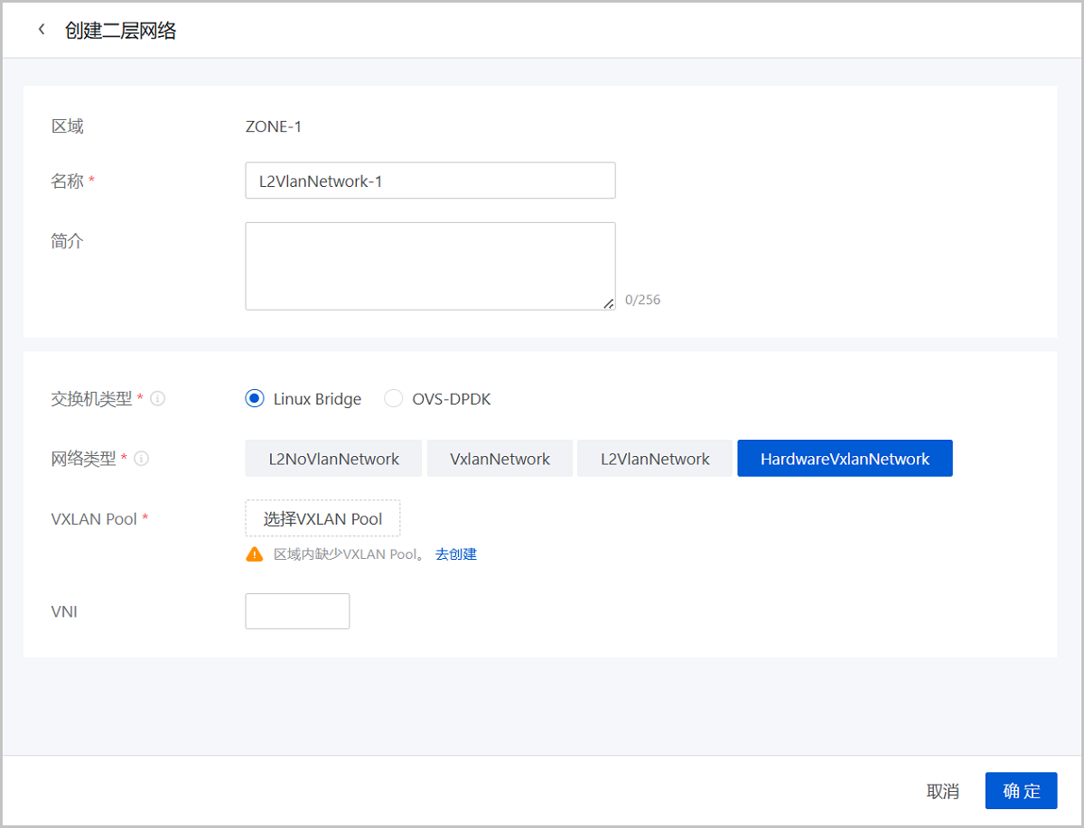 ethx格式的网卡名称会在系统重启后导致网卡顺序随机改变,尤其是带多网卡的云主机环境中,建议将各计算节点的网卡设备名称修改成非ethx格式,例如:可修改成em01格式。在ZStack Cloud主菜单,点击,进入二层网络界面。点击创建二层网络,弹出创建二层网络界面。
