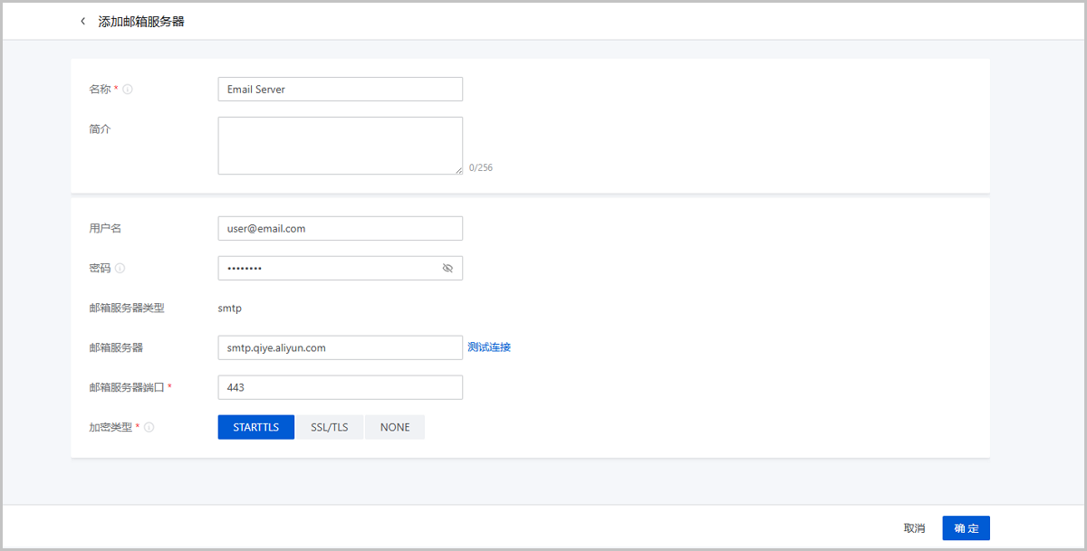 云平台报警选择邮箱类型的通知对象,需设置邮箱服务器,用来发送报警邮件。