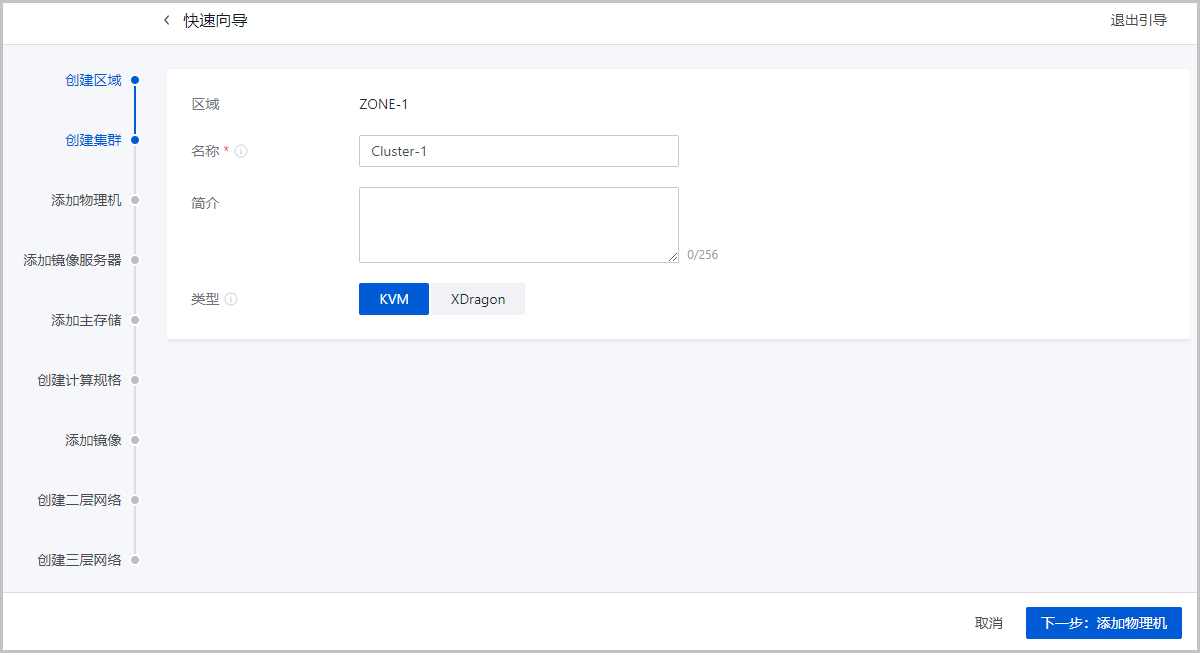 #创建一个名为test的普通用户 [root@localhost ~]# adduser test #授权test用户拥有sudo权限 [root@localhost ~]# echo "test ALL=(ALL) NOPASSWD: ALL" >>/etc/sudoers若Wizard引导设置结束后,要在同一区域的同一集群中再添加其它物理机,则对应主机需安装相同的操作系统。SSH端口、用户名、密码无须相同。