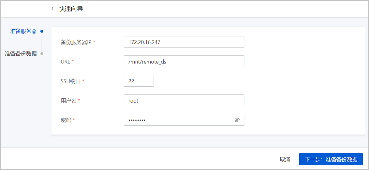 • 挂载路径:填写异地备份服务器上挂载的存储路径,例如/mnt/remote_ds
