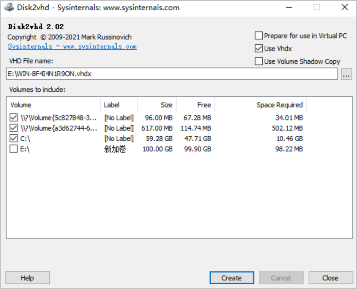 双击运行disk2vhd64程序,选择镜像存放路径,并点击Create制作系统盘镜像vhdx。