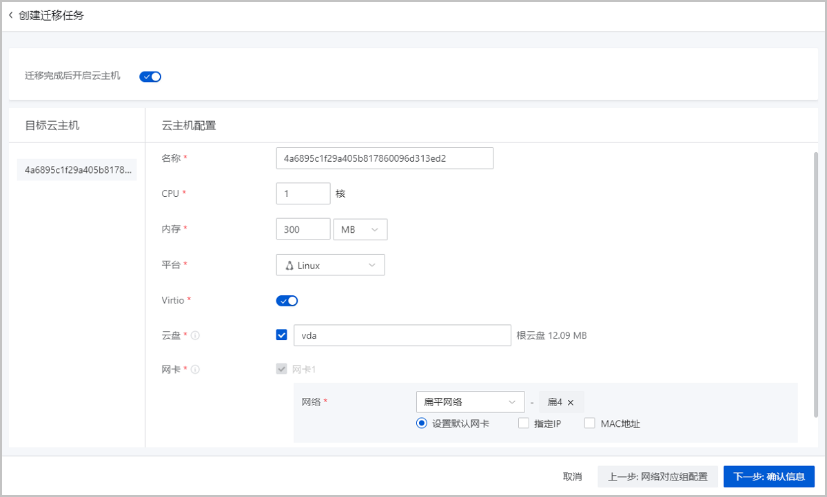 说明: 云主机迁移至当前云平台,要求至少配置一张网卡。