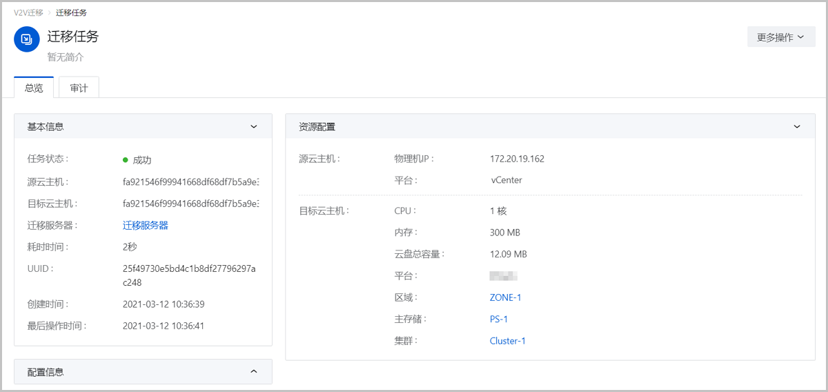V2V迁移界面,选择某一迁移任务,展开其详情页,可查看当前迁移任务状态和信息,以及源云主机和目标云主机的基本信息。
