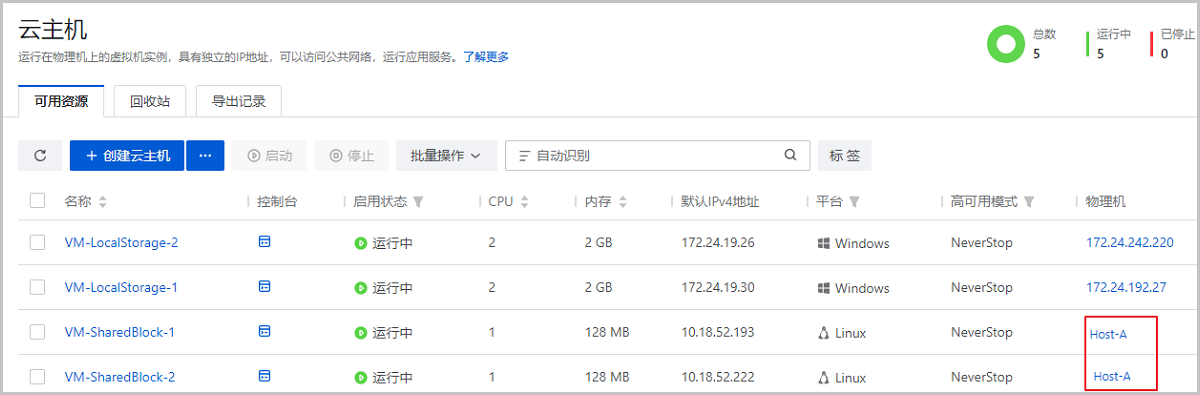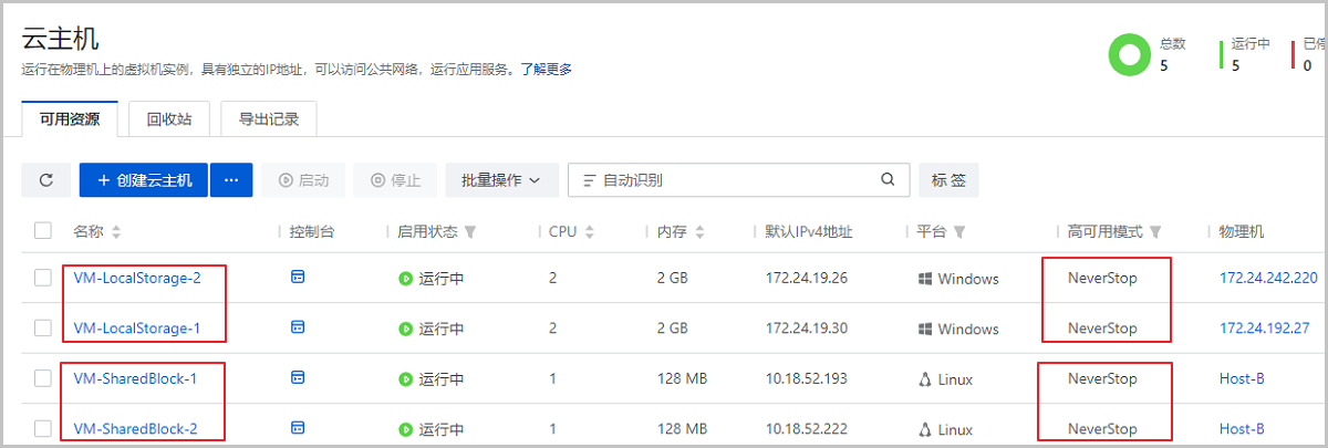 场景假定:用户部署4台云主机运行公司重要业务,其中2台云主机部署在SharedBlock存储上,2台部署在本地存储上。要求任意一台云主机异常停机(例如,物理机掉电、云主机过载等各类因素导致云主机停机)后能自动重启,以保障业务连续性。