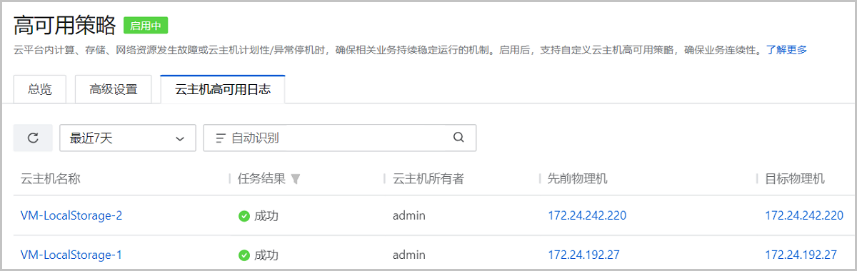 云主机VM-LocalStorage-1和VM-LocalStorage-2分别部署在不同物理机上,云主机数据存储在本地存储上。两台云主机异常停机时,自动触发高可用启动。