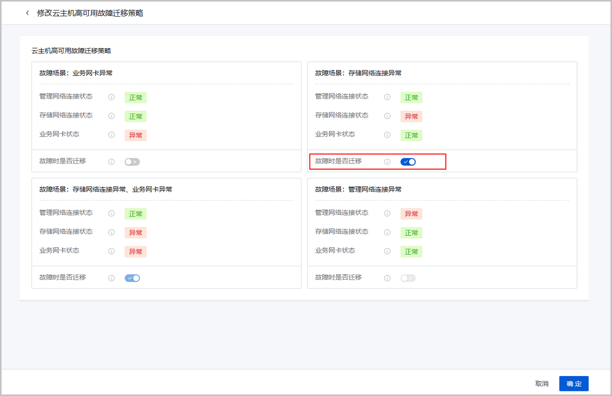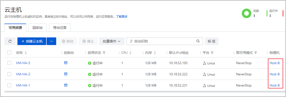 场景假定:用户在物理机Host A上部署了3台云主机用于运行重要业务,并使用Ceph主存储存储云主机数据。要求物理机Host A与Ceph存储网失联时,所有3台云主机迁移至其他物理机,以保障业务高可用。此场景下,可将这些云主机高可用模式均设置为NeverStop,且设置存储网络连接状态故障时触发迁移,并确保云平台内物理机资源充足。