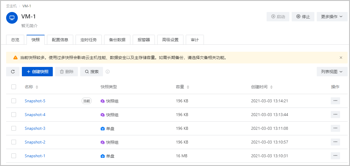 在生产环境中,建议单块磁盘的快照数量尽量控制在5以内,快照过多会影响云主机/云盘的IO性能、数据安全以及主存储容量。不建议进行高频的定时快照备份。如需长期备份,请选择灾备相关功能。
