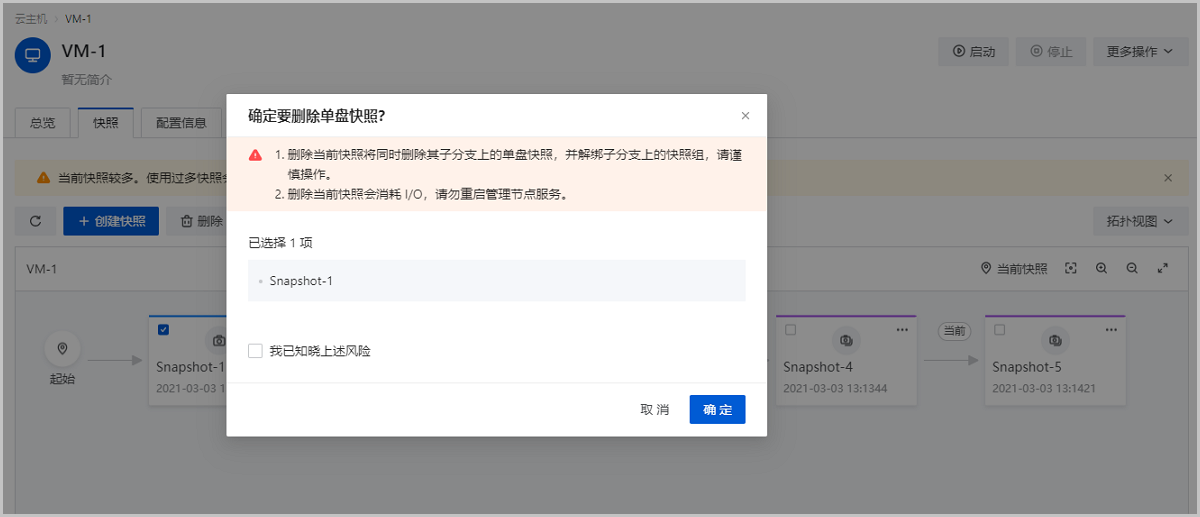 以删除某一云主机单盘快照为例,在ZStack Cloud主菜单,点击,进入云主机界面,选择某一云主机(运行中/已暂停/已停止),在云主机详情页的快照子页面,选择某一单盘快照,执行删除操作,弹出删除快照确认框。