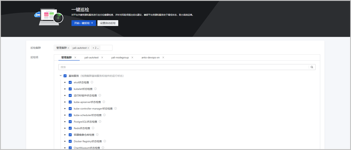 用户可自定义选择集群和巡检项进行一键巡检,启动巡检后,平台将对所选择的巡检项涉及的资源或服务进行健康检查。详细巡检项信息可参考巡检项总览。