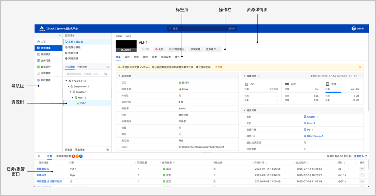 • 资源树:位于资源清单的二级菜单下方,以树形结构展示系统中的资源,如虚拟机、数据存储、分布式交换机等。您可通过资源树层级化浏览和管理资源,支持展开/折叠节点,提供右键菜单。
